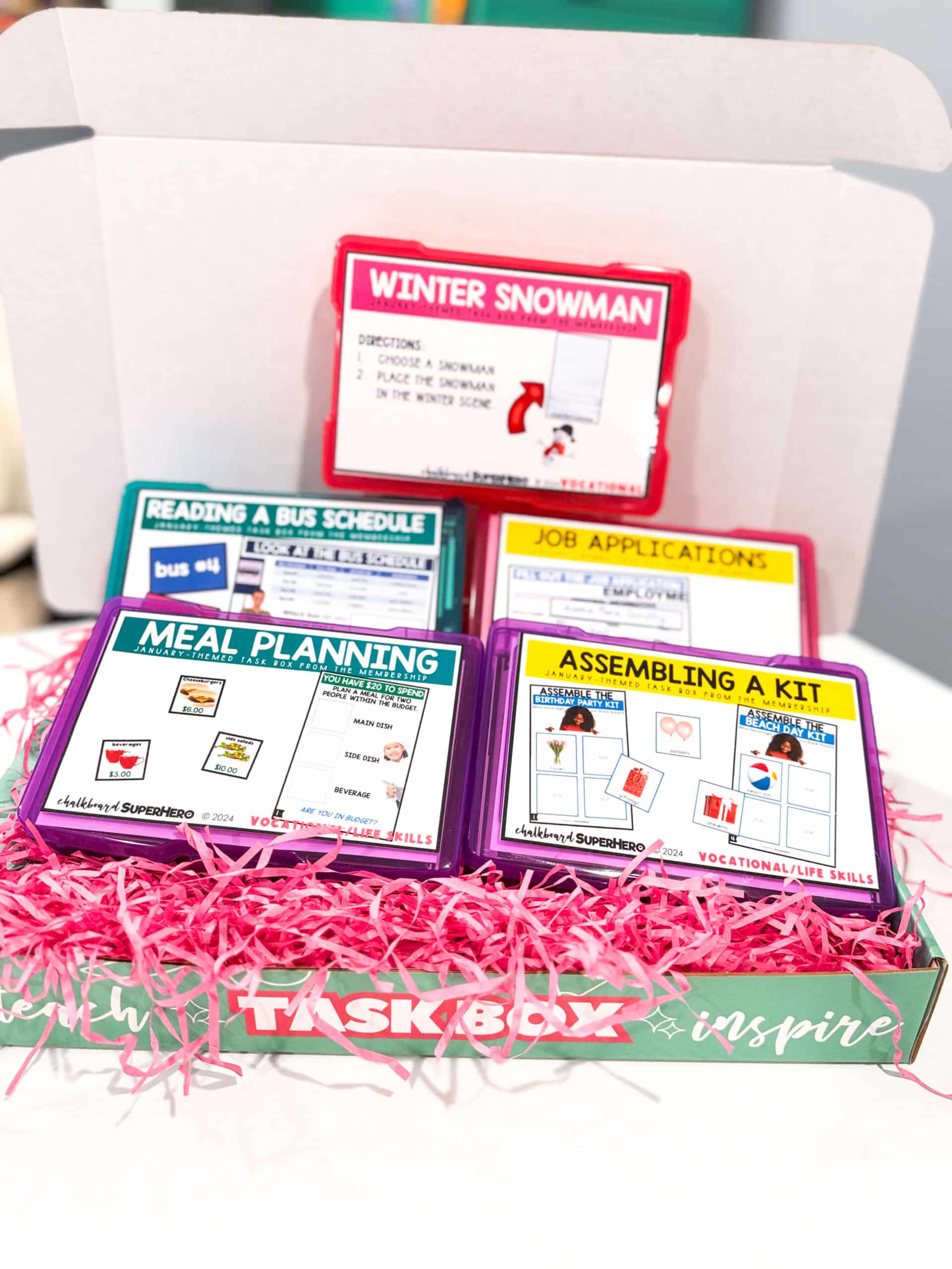 - 5 Fully prepped, never-seen-before, task Boxes (Due to shipping constraints, you’ll receive 4 sets in plastic boxes + 1 additional set, prepped and ready to go, underneath your 4 boxes)