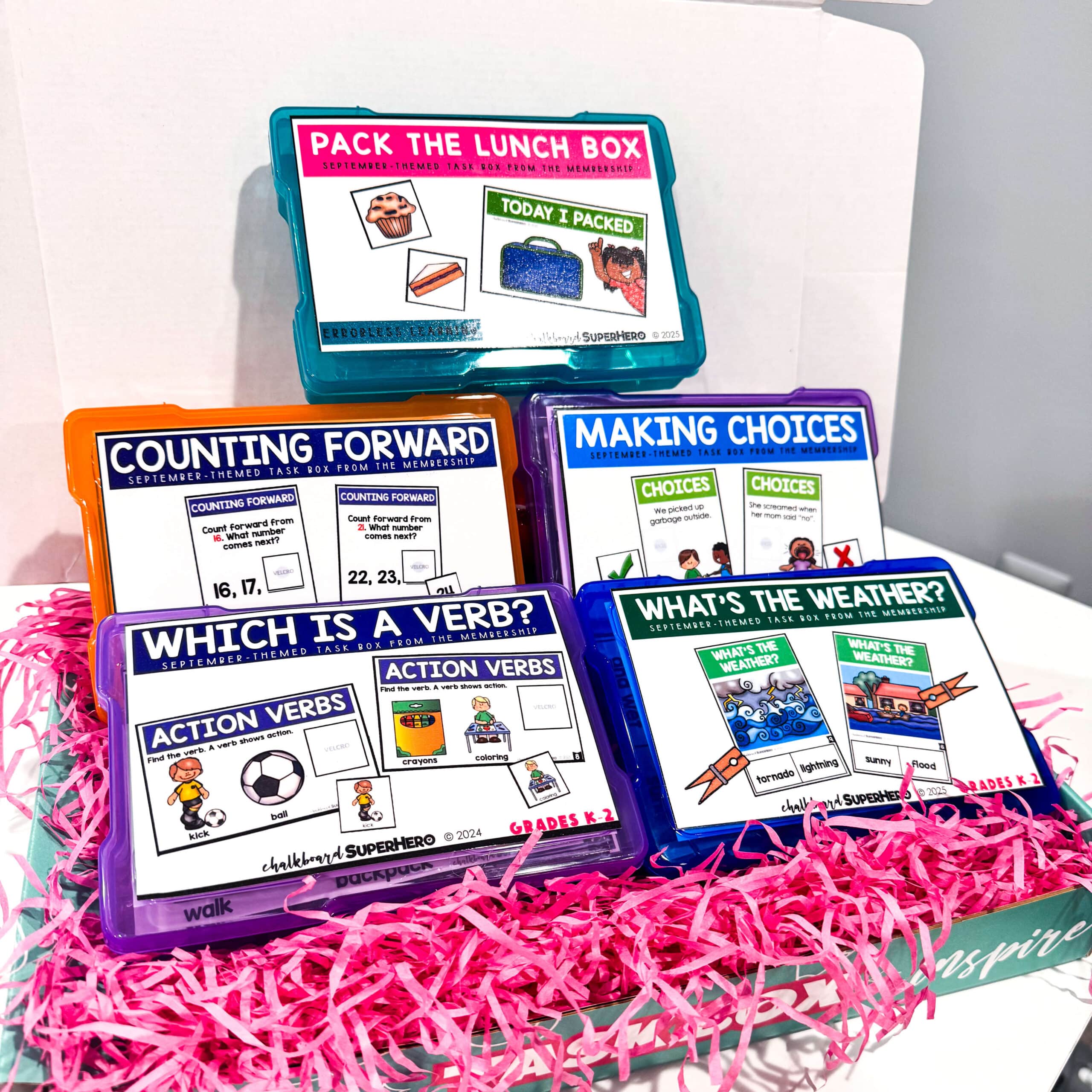 - 5 Fully prepped, never-seen-before, task Boxes (Due to shipping constraints, you’ll receive 4 sets in plastic boxes + 1 additional set, prepped and ready to go, underneath your 4 boxes)