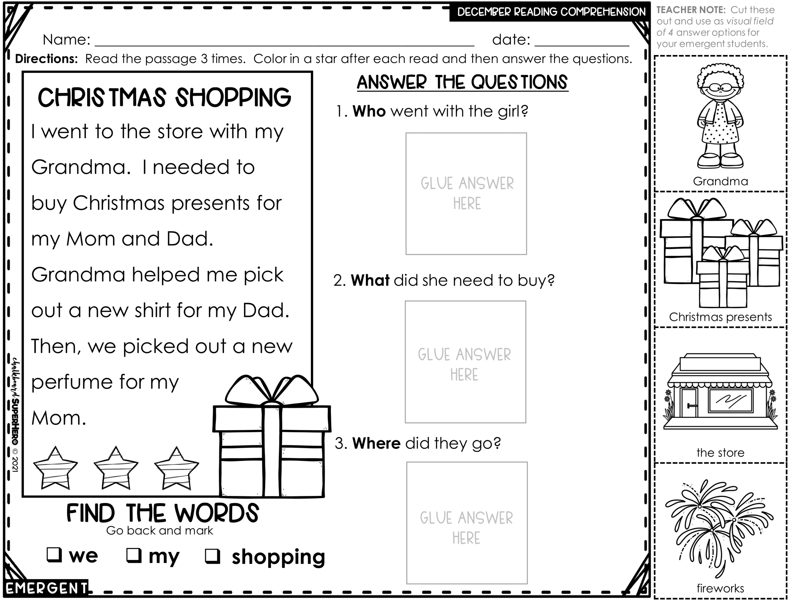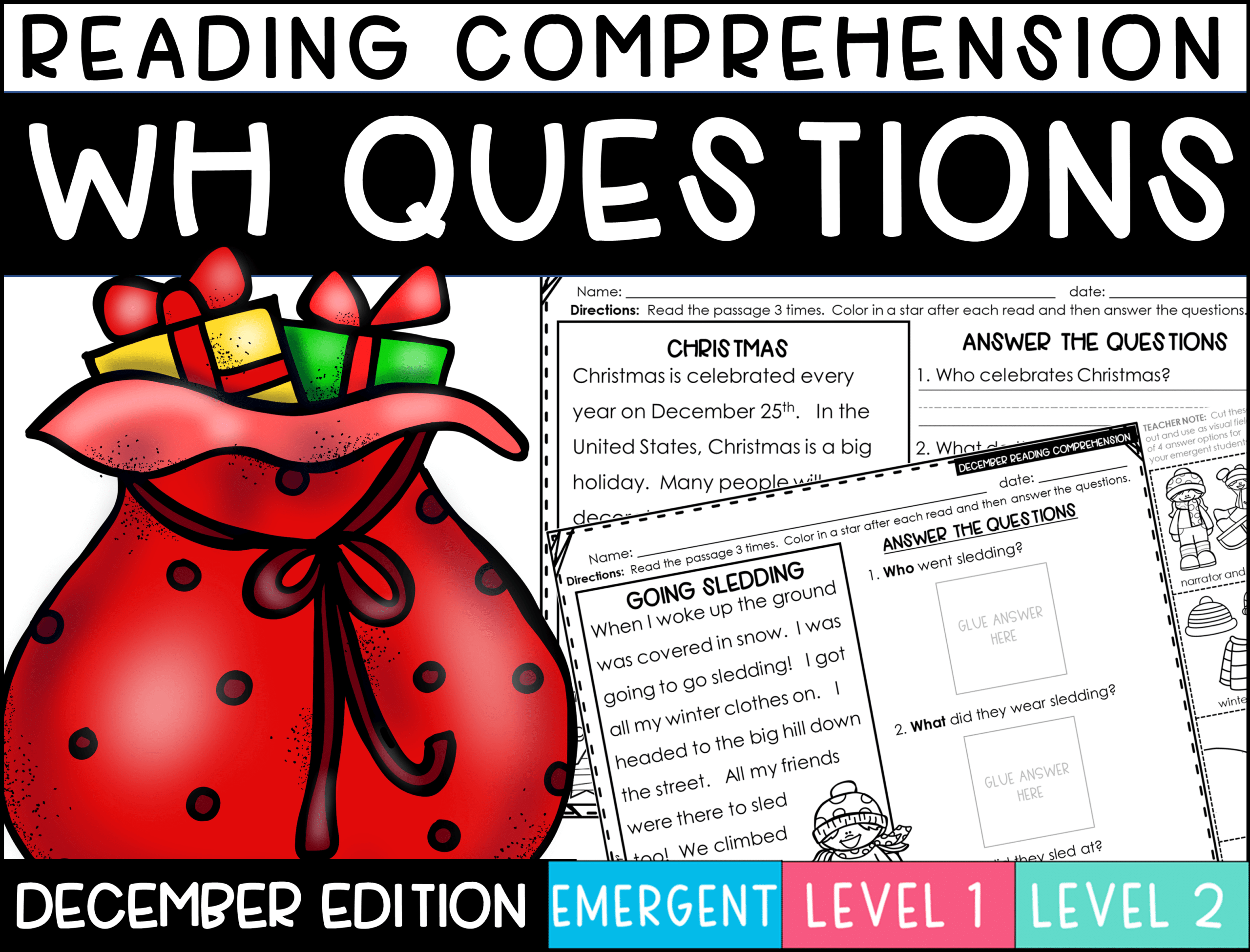 Answering WH questions (who, what, when, where) in any text can be difficult for many students, especially those with special needs. Here are 15 DECEMBER-themed passages that you can use in your classroom. Now with 2 different levels so that you can differentiate your worksheets. You can work on following directions, answering -wh questions, and going back and finding the evidence all on the same worksheet. The student can read the passage three times to work on fluency and then color the star each time. There are no why questions in this pack, this is the hardest question to answer and I want to work on that question separately.